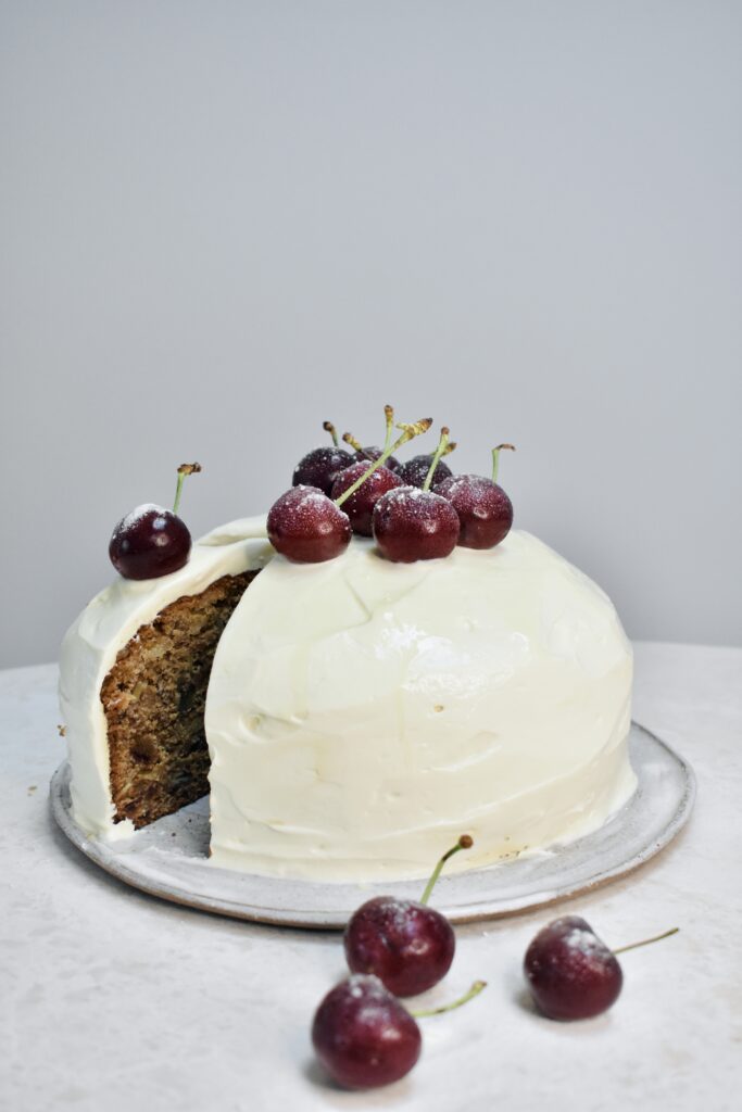 Once the cake is done remove and allow to cool for at least 30 mins in the tin. Use a pallet knife around the edges of the tin and carefully remove the sides of the tin if using a sprung one and transfer to a cooling rack for a further 60 minutes. Place in the fridge for 30-60 mins so it is chilled before spreading over the frosting evenly. Use a pallet knife to smooth. Place back in the fridge for a few hours (or overnight) to set. When you are ready to serve use the remaining half of the frosting ingredients and make as per the above. Spread over a second time. Add cherries or other decoration to finish.